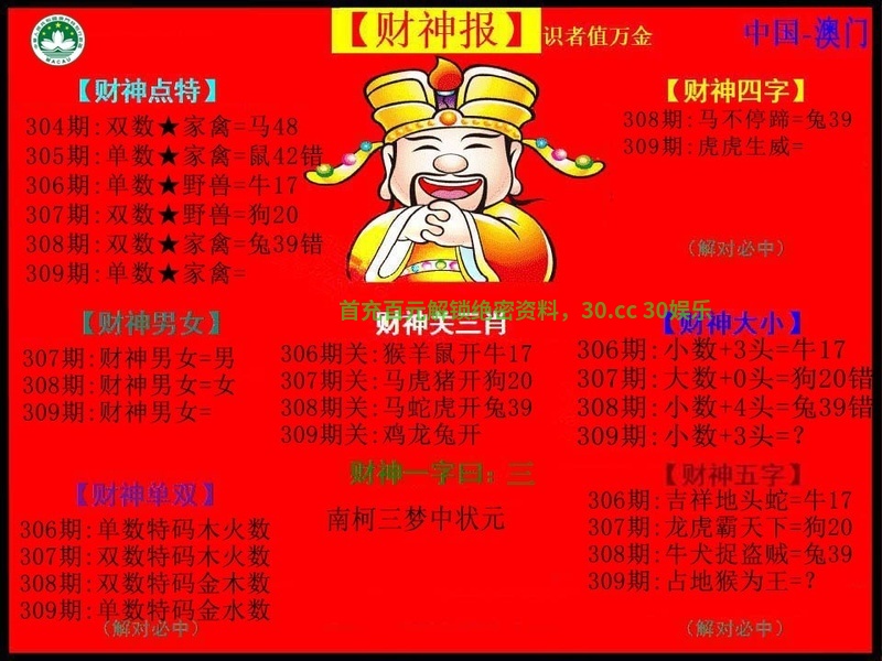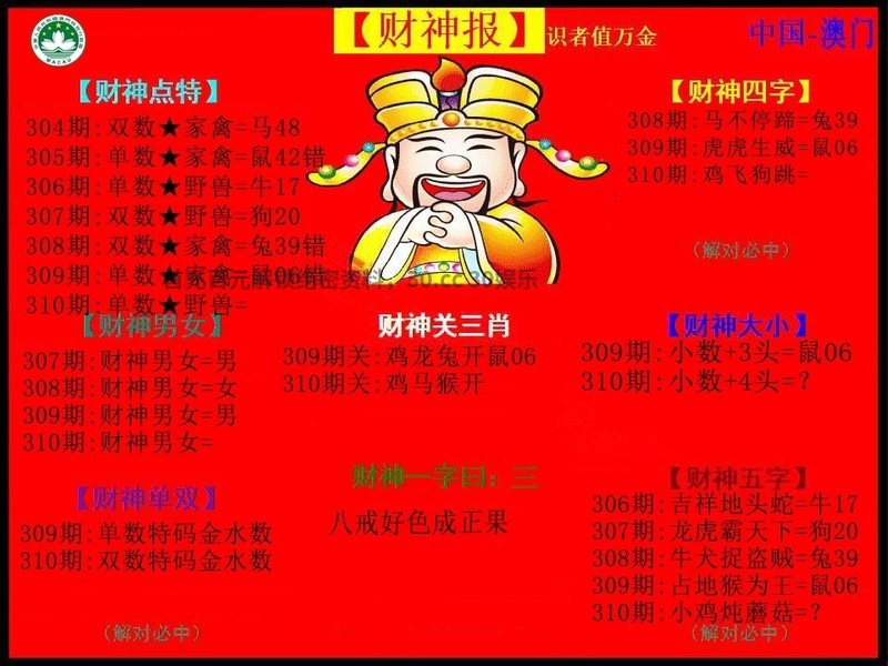 | 309期:【前后四肖】开:鼠06准 前【虎兔鼠龙】后【猪鸡羊马】 |